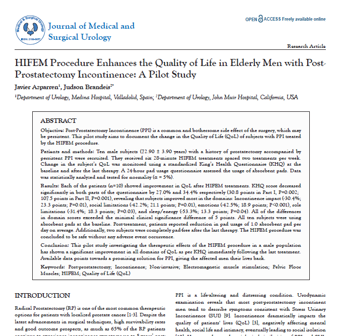 Procedimento com HIFEM Melhora a Qualidade de Vida em Homens Idosos com Incontinência Pós-Prostatectomia Estudo Piloto